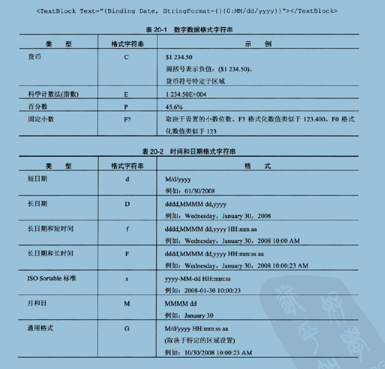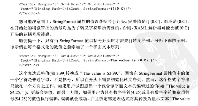 <Window x:Class="WpfApplicationDEMO.MainWindow" xmlns="http://schemas.microsoft.com/winfx/2006/xaml/presentation" xmlns:x="http://schemas.microsoft.com/winfx/2006/xaml" Title="MainWindow" Height="350" Width="525" > <Window.Resources> <Style TargetType="TextBlock"> <Setter Property="Height" Value="30"></Setter> </Style> </Window.Resources> <StackPanel> <TextBlock Text="{Binding Path=Price, StringFormat={}{0:C}}" ></TextBlock> <TextBlock Text="{Binding Path=Price, StringFormat=The Value is {0:C}}" ></TextBlock> <TextBlock Text="{Binding Path=Price, StringFormat=The Value is {0:E}}"></TextBlock> <TextBlock Text="{Binding Path=Price, StringFormat=The Value is {0:P}}"></TextBlock> <TextBlock Text="{Binding Path=Price, StringFormat=The Value is {0:F2}}"></TextBlock> <TextBlock Text="{Binding Path=CreateDate, StringFormat=The Value is {0:d}}"></TextBlock> <TextBlock Text="{Binding Path=CreateDate, StringFormat=The Value is {0:D}}"></TextBlock> <TextBlock Text="{Binding Path=CreateDate, StringFormat=The Value is {0:f}}"></TextBlock> <TextBlock Text="{Binding Path=CreateDate, StringFormat=The Value is {0:F}}"></TextBlock> <TextBlock Text="{Binding Path=CreateDate, StringFormat=The Value is {0:s}}"></TextBlock> <TextBlock Text="{Binding Path=CreateDate, StringFormat=The Value is {0:M}}"></TextBlock> <TextBlock Text="{Binding Path=CreateDate, StringFormat=The Value is {0:G}}"></TextBlock> </StackPanel> </Window>