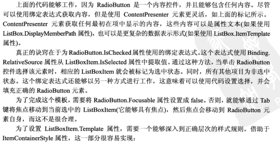 <Style x:Key="radioButtonlistStyle" TargetType="{x:Type ListBox}"> <Setter Property="ItemContainerStyle"> <Setter.Value> <Style TargetType="{x:Type ListBoxItem}" > <!--<Setter Property="IsSelected" Value="{Binding RelativeSource ={ RelativeSource Self}, Path=DataContext.IsChecked}"></Setter>--> <Setter Property="IsSelected" Value="{Binding IsChecked}"></Setter> <Setter Property="Margin" Value="2"></Setter> <Setter Property="Template"> <Setter.Value> <ControlTemplate TargetType="{x:Type ListBoxItem}"> <RadioButton IsChecked="{Binding IsSelected,Mode=TwoWay,RelativeSource={RelativeSource TemplatedParent}}"> <ContentPresenter ></ContentPresenter> </RadioButton> </ControlTemplate> </Setter.Value> </Setter> </Style> </Setter.Value> </Setter> </Style>