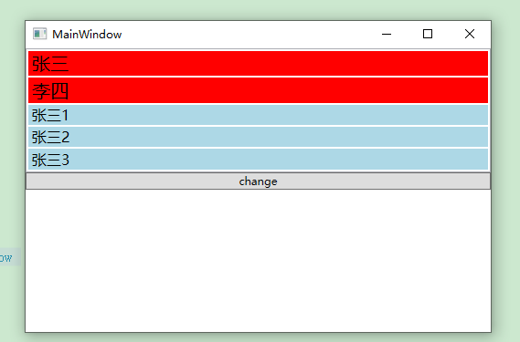 <Window x:Class="WpfApplicationDEMO.MainWindow" xmlns="http://schemas.microsoft.com/winfx/2006/xaml/presentation" xmlns:x="http://schemas.microsoft.com/winfx/2006/xaml" Title="MainWindow" Height="350" Width="525" xmlns:local="clr-namespace:WpfApplicationDEMO" > <Window.Resources> <Style x:Key="ItemHighStyle" TargetType="{x:Type ListBoxItem}"> <Setter Property="Background" Value="Red"></Setter> <Setter Property="FontSize" Value="20"></Setter> </Style> <Style x:Key="ItemDefaultStyle" TargetType="{x:Type ListBoxItem}"> <Setter Property="Background" Value="LightBlue"></Setter> <Setter Property="FontSize" Value="16"></Setter> </Style> </Window.Resources> <StackPanel> <ListBox Name="listbox" AlternationCount="2" DisplayMemberPath="Name" ItemsSource="{Binding Products}" ItemContainerStyleSelector="{Binding MyStyleSelector}" > </ListBox> <Button Command="{Binding TestRelayCommand}" CommandParameter="{Binding ElementName=listbox}">change</Button> </StackPanel> </Window>