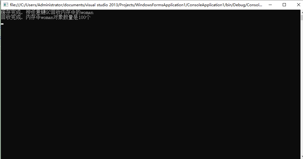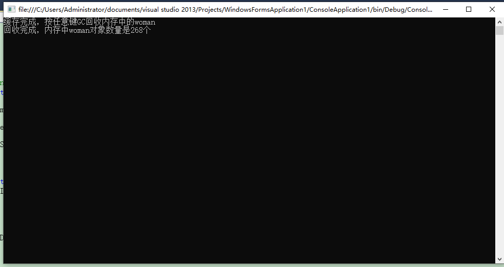 //模拟记录缓存数据 for (int i = 0; i < 100; i++) { if (dics.ContainsKey(i)) { continue; } else { Woman w = new Woman(); w.Name = "范冰冰"; dics.Add(i, w); } } Console.WriteLine(string.Format("缓存完成,按任意键GC回收内存中的woman")); Console.ReadKey(); GC.Collect(); Console.WriteLine(string.Format("回收完成,内存中woman对象数量是{0}个",Woman.Count)); Console.ReadKey(); } }