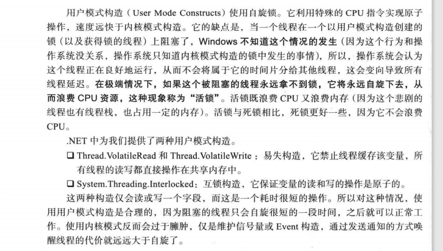 用户模式构造:用特殊的CPU指令来协调线程的,通常都进行原子操作,volatile和interlocked就是一种,用户模式构造速度显著比内核模式构造要快。