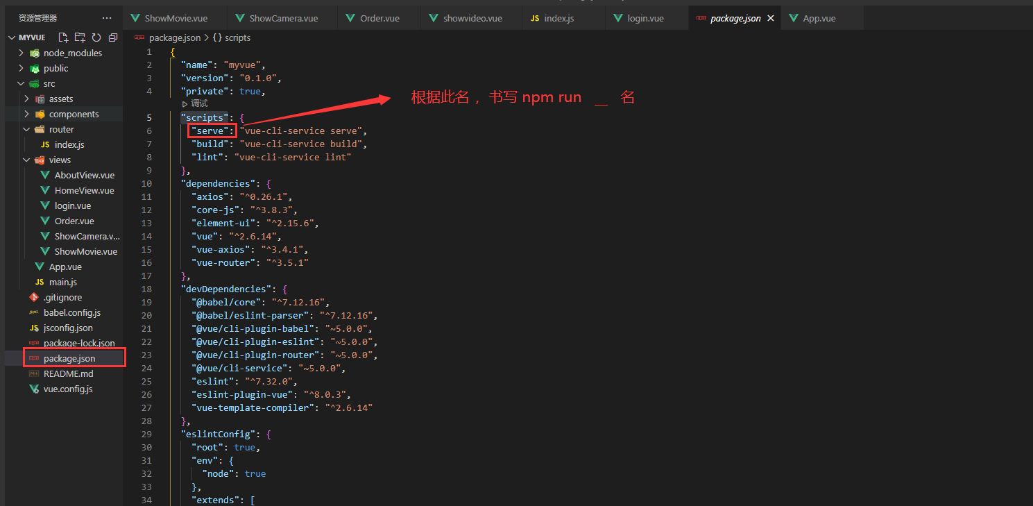 根据package.json文件中"scripts"里的别名进行书写run后面的别名