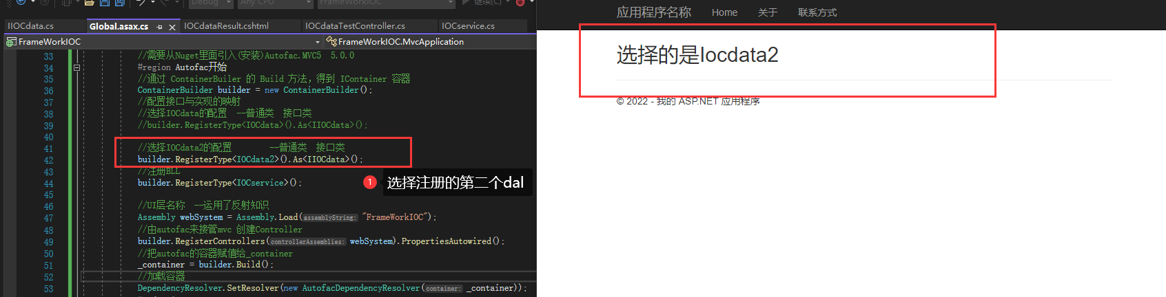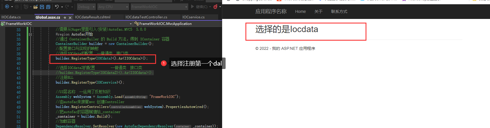 public class MvcApplication : System.Web.HttpApplication { private static IContainer _container; public static IContainer Container { get { return _container; } } protected void Application_Start() { AreaRegistration.RegisterAllAreas(); FilterConfig.RegisterGlobalFilters(GlobalFilters.Filters); RouteConfig.RegisterRoutes(RouteTable.Routes); BundleConfig.RegisterBundles(BundleTable.Bundles); //需要从Nuget里面引入(安装)Autofac.MVC5 5.0.0 #region Autofac开始 //通过 ContainerBuiler 的 Build 方法,得到 IContainer 容器 ContainerBuilder builder = new ContainerBuilder(); //配置接口与实现的映射 //选择IOCdata的配置 --普通类 接口类 builder.RegisterType<IOCdata>().As<IIOCdata>(); //选择IOCdata2的配置 --普通类 接口类 //builder.RegisterType<IOCdata2>().As<IIOCdata>(); //注册BLL builder.RegisterType<IOCservice>(); //UI层名称 --运用了反射知识 Assembly webSystem = Assembly.Load("FrameWorkIOC"); //由autofac来接管mvc 创建Controller builder.RegisterControllers(webSystem).PropertiesAutowired(); //把autofac的容器赋值给_container _container = builder.Build(); //加载容器 DependencyResolver.SetResolver(new AutofacDependencyResolver(_container)); #endregion } }