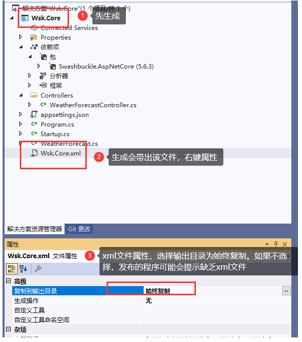 如果没有点始终复制,将来发布到其他地方时候,有可能不会带出xml文档,轻则swagger不会显示注释,重则页面打开会报错文件丢失等