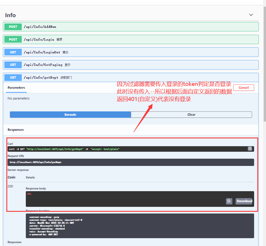 *但是使用过滤器后,在进行Swagger测试时,无法给过滤器传入Token,在运行对应方法时,一直提示我们没有登录(token为空),