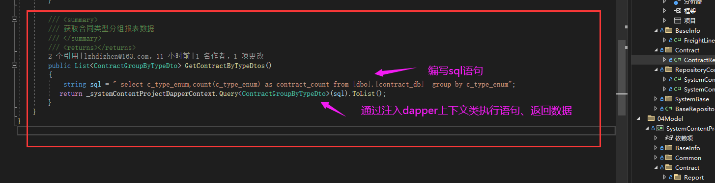 引入dapper原因:使用ef编写查询linq语句有点麻烦,所以使用dapper编写sql语句较为方便些