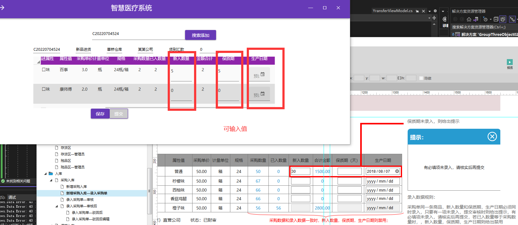 <DataGrid x:Name="TenantDataGrids" Width="779" Height="194" AutoGenerateColumns="False" CanUserAddRows="False" ColumnHeaderStyle="{DynamicResource MyDataGridColumnHeadeStyle}" HeadersVisibility="All" ItemsSource="{Binding PurchaseInfoList}"> <DataGrid.Columns> <!--<DataGridTemplateColumn Width="50"></DataGridTemplateColumn>? <DataGridTemplateColumn Width="50" /> <DataGridTemplateColumn Width="50" />--> <DataGridTextColumn Binding="{Binding GoodInfo.commoditycode}" EditingElementStyle="{StaticResource MaterialDesignDataGridTextColumnEditingStyle}" ElementStyle="{StaticResource MaterialDesignDataGridTextColumnStyle}" Header="商品编码" /> <DataGridTextColumn Binding="{Binding GoodInfo.productname}" EditingElementStyle="{StaticResource MaterialDesignDataGridTextColumnEditingStyle}" ElementStyle="{StaticResource MaterialDesignDataGridTextColumnStyle}" Header="商品名称" /> <DataGridTextColumn Binding="{Binding PurchaseInfo.BuyNum}" EditingElementStyle="{StaticResource MaterialDesignDataGridTextColumnEditingStyle}" ElementStyle="{StaticResource MaterialDesignDataGridTextColumnStyle}" Header="已入数量" /> <DataGridTemplateColumn Width="100" Header="新入数量"> <DataGridTemplateColumn.CellTemplate> <!-- https://www.cnblogs.com/fdyang/p/10160503.html --> <!-- (WPF) Textbox 每次输入触发事件处理 --> <DataTemplate> <TextBox md:HintAssist.Hint="采购数量" DockPanel.Dock="Top" Text="{Binding SelectPurchaseGoods.BuyNum, Mode=TwoWay, UpdateSourceTrigger=PropertyChanged}"> <i:Interaction.Triggers> <i:EventTrigger EventName="TextChanged"> <i:InvokeCommandAction Command="{Binding Path=DataContext.BuyNumTextChanged, RelativeSource={RelativeSource AncestorType={x:Type DataGrid}}}" CommandParameter="{Binding}" /> </i:EventTrigger> </i:Interaction.Triggers> </TextBox> </DataTemplate> </DataGridTemplateColumn.CellTemplate> </DataGridTemplateColumn> <DataGridTextColumn Binding="{Binding PurchaseInfo.BuyNum}" EditingElementStyle="{StaticResource MaterialDesignDataGridTextColumnEditingStyle}" ElementStyle="{StaticResource MaterialDesignDataGridTextColumnStyle}" Header="金额合计" /> <DataGridTemplateColumn Width="100" Header="保质期"> <DataGridTemplateColumn.CellTemplate> <!-- https://www.cnblogs.com/fdyang/p/10160503.html --> <!-- (WPF) Textbox 每次输入触发事件处理 --> <DataTemplate> <TextBox md:HintAssist.Hint="采购数量" DockPanel.Dock="Top" Text="{Binding SelectPurchaseGoods.BuyNum, Mode=TwoWay, UpdateSourceTrigger=PropertyChanged}"> <i:Interaction.Triggers> <i:EventTrigger EventName="TextChanged"> <i:InvokeCommandAction Command="{Binding Path=DataContext.BuyNumTextChanged, RelativeSource={RelativeSource AncestorType={x:Type DataGrid}}}" CommandParameter="{Binding}" /> </i:EventTrigger> </i:Interaction.Triggers> </TextBox> </DataTemplate> </DataGridTemplateColumn.CellTemplate> </DataGridTemplateColumn> <DataGridTemplateColumn Width="100" Header="生产日期"> <DataGridTemplateColumn.CellTemplate> <!-- https://www.cnblogs.com/fdyang/p/10160503.html --> <!-- (WPF) Textbox 每次输入触发事件处理 --> <DataTemplate> <DatePicker Grid.Row="0" md:HintAssist.Hint="预计到货时间" DisplayDate="2019-01-01" SelectedDate="{Binding ActiveTime}" Style="{StaticResource MaterialDesignFilledDatePicker}"> <i:Interaction.Triggers> <i:EventTrigger EventName="TextChanged"> <i:InvokeCommandAction Command="{Binding Path=DataContext.BuyNumTextChanged, RelativeSource={RelativeSource AncestorType={x:Type DataGrid}}}" CommandParameter="{Binding}" /> </i:EventTrigger> </i:Interaction.Triggers> </DatePicker> </DataTemplate> </DataGridTemplateColumn.CellTemplate> </DataGridTemplateColumn> </DataGrid.Columns> </DataGrid>