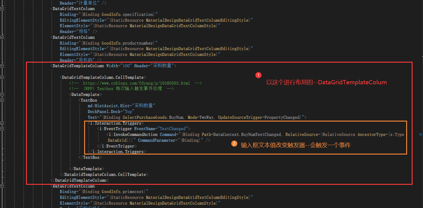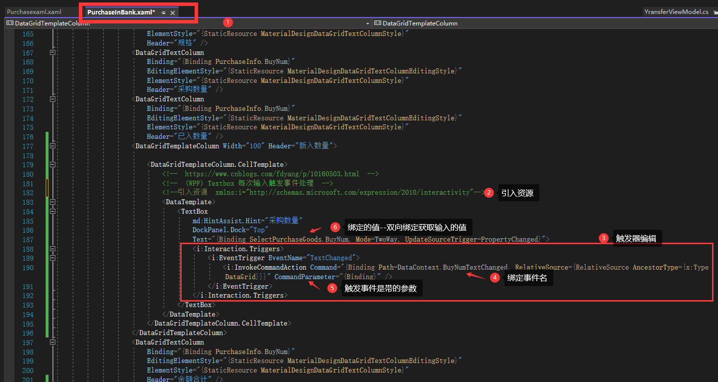<!-- https://www.cnblogs.com/fdyang/p/10160503.html --> <!-- (WPF) Textbox 每次输入触发事件处理 --> <!--引入资源 xmlns:i="http://schemas.microsoft.com/expression/2010/interactivity"--> <DataTemplate> <TextBox md:HintAssist.Hint="采购数量" DockPanel.Dock="Top" Text="{Binding SelectPurchaseGoods.BuyNum, Mode=TwoWay, UpdateSourceTrigger=PropertyChanged}"> <i:Interaction.Triggers> <i:EventTrigger EventName="TextChanged"> <i:InvokeCommandAction Command="{Binding Path=DataContext.BuyNumTextChanged, RelativeSource={RelativeSource AncestorType={x:Type DataGrid}}}" CommandParameter="{Binding}" /> </i:EventTrigger> </i:Interaction.Triggers> </TextBox> </DataTemplate>