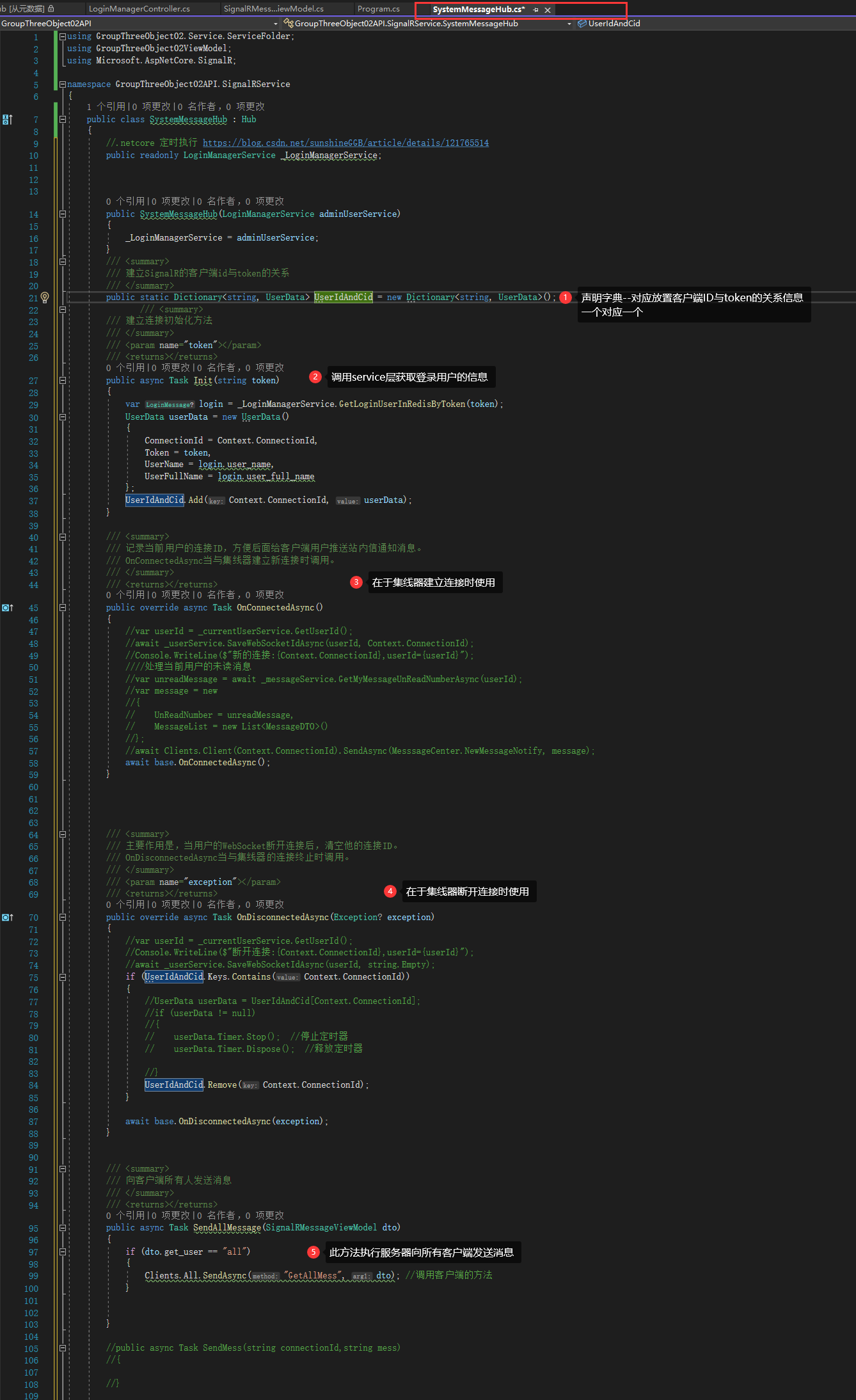 public class SystemMessageHub : Hub { //.netcore 定时执行 https://blog.csdn.net/sunshineGGB/article/details/121765514 public readonly LoginManagerService _LoginManagerService; public SystemMessageHub(LoginManagerService adminUserService) { _LoginManagerService = adminUserService; } /// <summary> /// 建立SignalR的客户端id与token的关系 /// </summary> public static Dictionary<string, UserData> UserIdAndCid = new Dictionary<string, UserData>(); /// <summary> /// 建立连接初始化方法 /// </summary> /// <param name="token"></param> /// <returns></returns> public async Task Init(string token) { var login = _LoginManagerService.GetLoginUserInRedisByToken(token); UserData userData = new UserData() { ConnectionId = Context.ConnectionId, Token = token, UserName = login.user_name, UserFullName = login.user_full_name }; UserIdAndCid.Add(Context.ConnectionId, userData); } /// <summary> /// 记录当前用户的连接ID,方便后面给客户端用户推送站内信通知消息。 /// OnConnectedAsync当与集线器建立新连接时调用。 /// </summary> /// <returns></returns> public override async Task OnConnectedAsync() { //var userId = _currentUserService.GetUserId(); //await _userService.SaveWebSocketIdAsync(userId, Context.ConnectionId); //Console.WriteLine($"新的连接:{Context.ConnectionId},userId={userId}"); ////处理当前用户的未读消息 //var unreadMessage = await _messageService.GetMyMessageUnReadNumberAsync(userId); //var message = new //{ // UnReadNumber = unreadMessage, // MessageList = new List<MessageDTO>() //}; //await Clients.Client(Context.ConnectionId).SendAsync(MesssageCenter.NewMessageNotify, message); await base.OnConnectedAsync(); } /// <summary> /// 主要作用是,当用户的WebSocket断开连接后,清空他的连接ID。 /// OnDisconnectedAsync当与集线器的连接终止时调用。 /// </summary> /// <param name="exception"></param> /// <returns></returns> public override async Task OnDisconnectedAsync(Exception? exception) { //var userId = _currentUserService.GetUserId(); //Console.WriteLine($"断开连接:{Context.ConnectionId},userId={userId}"); //await _userService.SaveWebSocketIdAsync(userId, string.Empty); if (UserIdAndCid.Keys.Contains(Context.ConnectionId)) { //UserData userData = UserIdAndCid[Context.ConnectionId]; //if (userData != null) //{ // userData.Timer.Stop(); //停止定时器 // userData.Timer.Dispose(); //释放定时器 //} UserIdAndCid.Remove(Context.ConnectionId); } await base.OnDisconnectedAsync(exception); } /// <summary> /// 向客户端所有人发送消息 /// </summary> /// <returns></returns> public async Task SendAllMessage(SignalRMessageViewModel dto) { if (dto.get_user == "all") { Clients.All.SendAsync("GetAllMess", dto); //调用客户端的方法 } } //public async Task SendMess(string connectionId,string mess) //{ //} //public void StartTime(object? sender, ElapsedEventArgs e,string connectionId, Hub hub) //{ // UserData userData = UserIdAndCid[connectionId]; // if (userData == null) // { // return; // } //} } public class UserData { public string ConnectionId { get; set; } public string Token { get; set; } public string UserName { get; set; } public string UserFullName { get; set; } public DateTime LoginDate { get; set; } }
