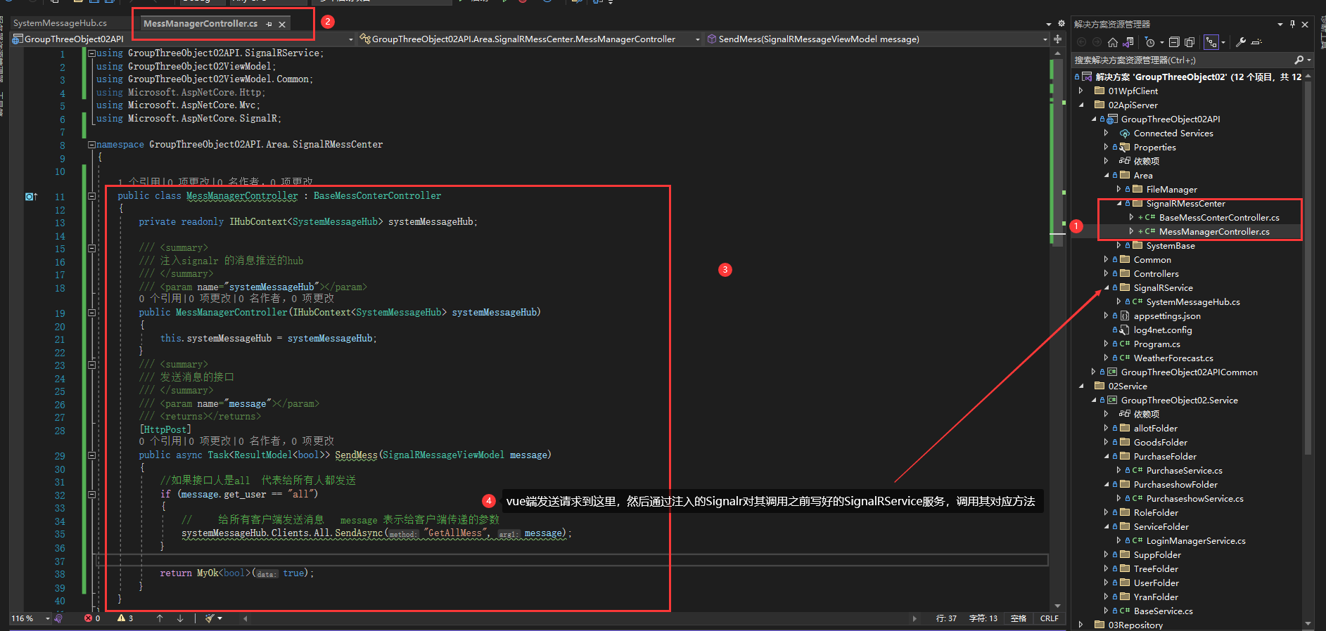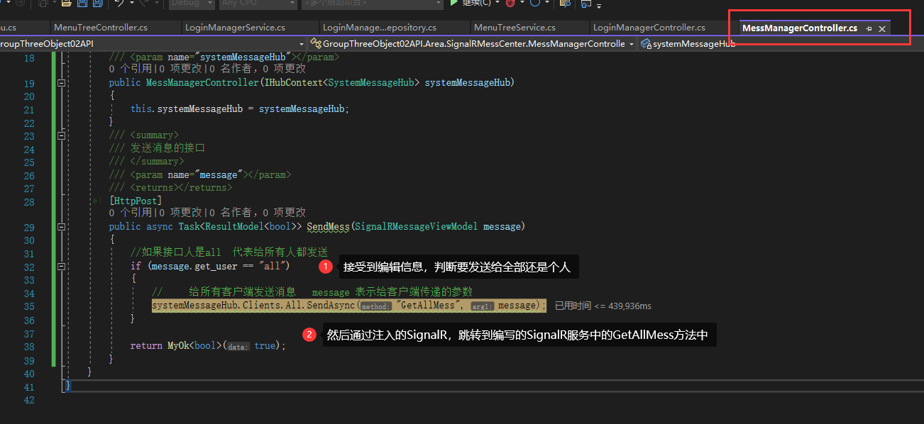 public class MessManagerController : BaseMessConterController { private readonly IHubContext<SystemMessageHub> systemMessageHub; /// <summary> /// 注入signalr 的消息推送的hub /// </summary> /// <param name="systemMessageHub"></param> public MessManagerController(IHubContext<SystemMessageHub> systemMessageHub) { this.systemMessageHub = systemMessageHub; } /// <summary> /// 发送消息的接口 /// </summary> /// <param name="message"></param> /// <returns></returns> [HttpPost] public async Task<ResultModel<bool>> SendMess(SignalRMessageViewModel message) { //如果接口人是all 代表给所有人都发送 if (message.get_user == "all") { // 给所有客户端发送消息 message 表示给客户端传递的参数 systemMessageHub.Clients.All.SendAsync("GetAllMess", message); } return MyOk<bool>(true); } }
