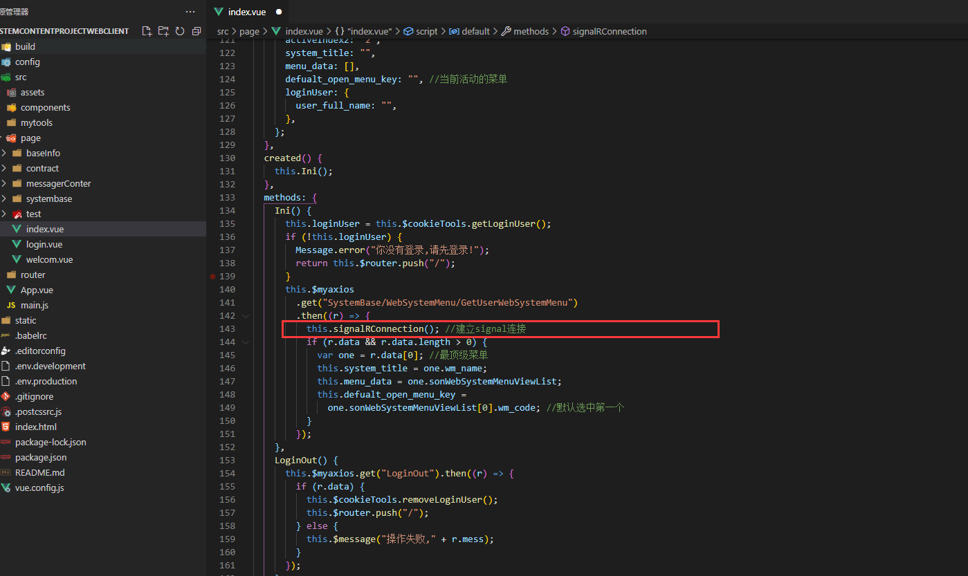 该Index是作为基页的,其他的页路由都配置他的children那里--所以在这个也一初始化开始就建立下signal连接