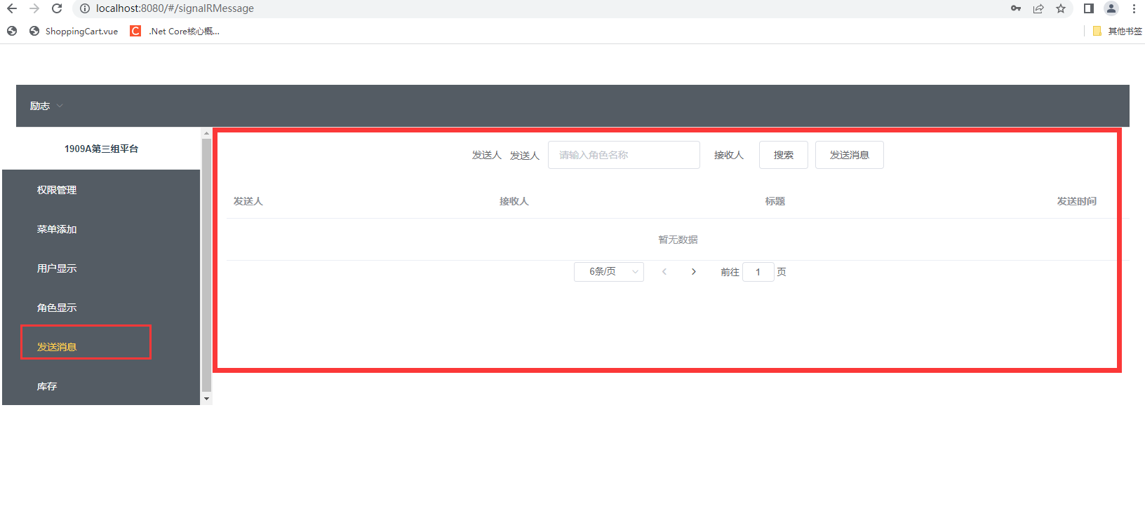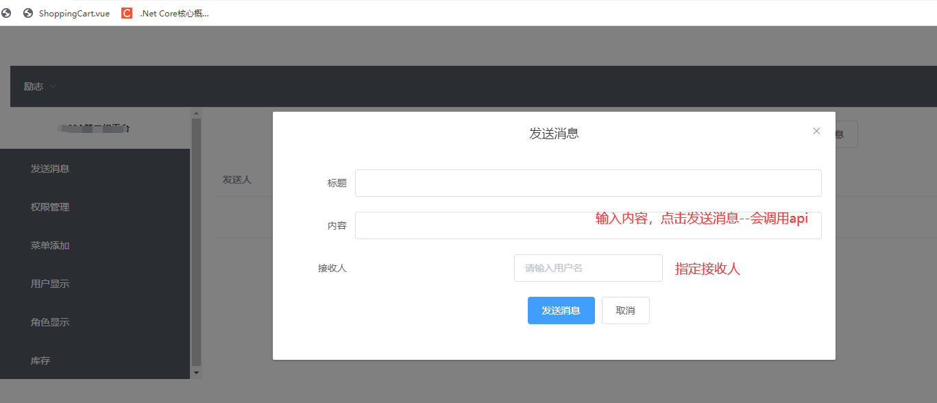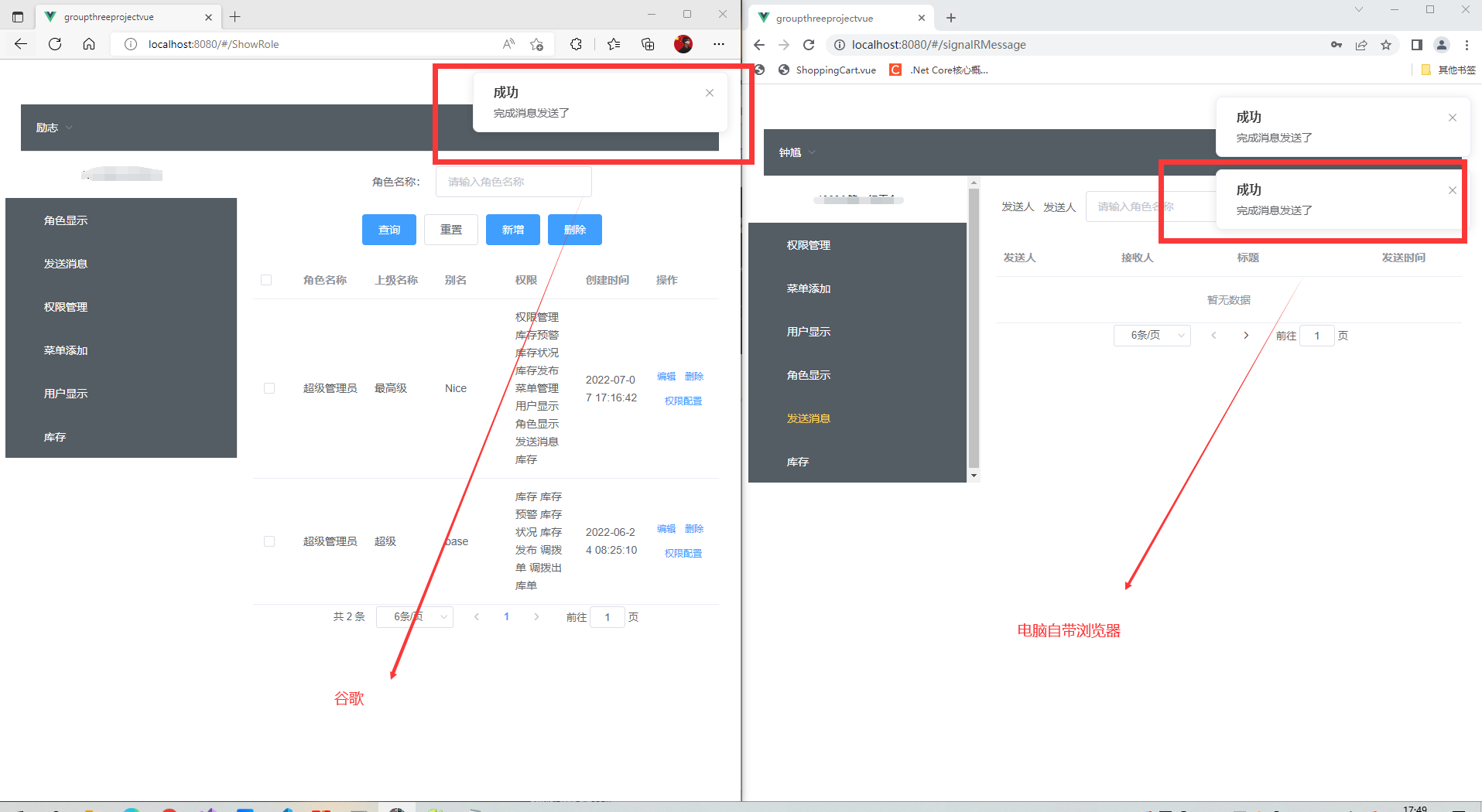 3、实现效果--》在谷歌浏览器和电脑自带浏览器(本机两个浏览器)各自登录项目--在其中一个点开发送消息(下拉选全部)--另一个也会有一个消息弹窗