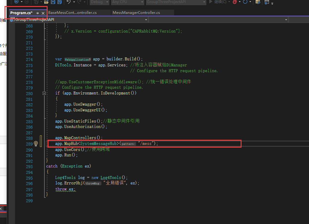 4、在Program中加入Signalr的hub的访问路径,用于让前端进行访问
