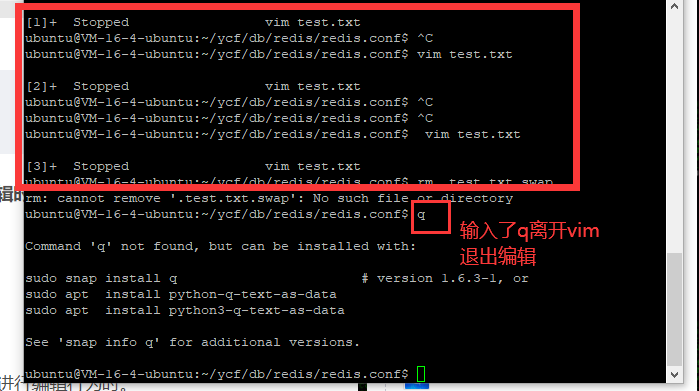 1、安装Redis遇到问题--创建文本命令过程中发现操作错误了,直接断掉重新开始后会出现下面这个+Stopped这个错误,然后输入退出编辑就好了