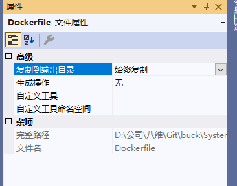 2-3 右键选中Dockerfile,选择属性>>复制到输出目录改为始终复制,如下图: