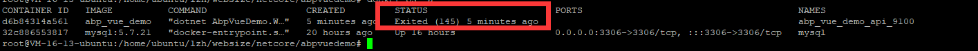 执行命令docker ps -a 查看所有docker,如下图,提示Exited(145) 5minutes ago,意思是5分钟前退出,说明可能是某个错误引发的退出