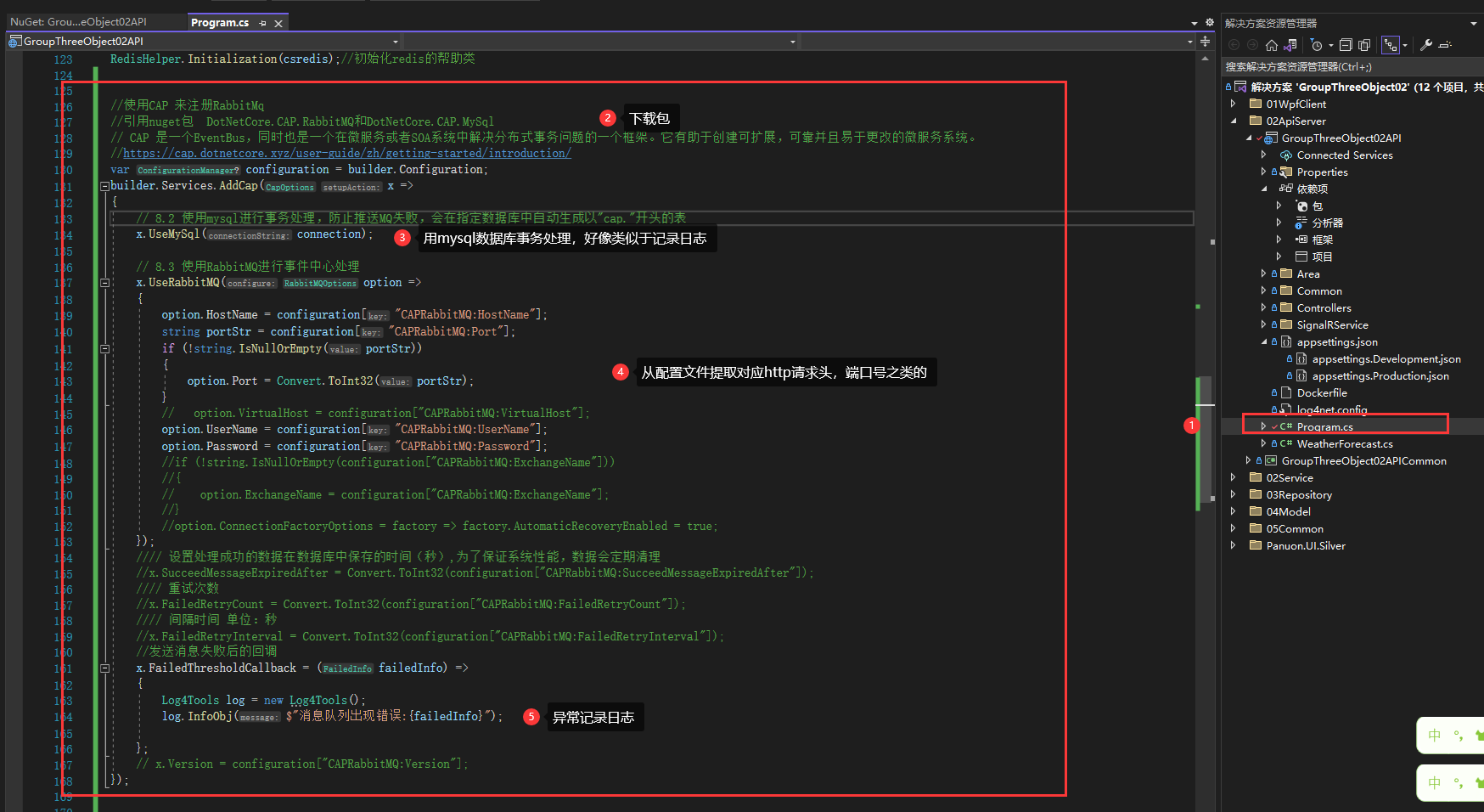 //使用CAP 来注册RabbitMq //引用nuget包 DotNetCore.CAP.RabbitMQ和DotNetCore.CAP.MySql // CAP 是一个EventBus,同时也是一个在微服务或者SOA系统中解决分布式事务问题的一个框架。它有助于创建可扩展,可靠并且易于更改的微服务系统。 //https://cap.dotnetcore.xyz/user-guide/zh/getting-started/introduction/ var configuration = builder.Configuration; builder.Services.AddCap(x => { // 8.2 使用mysql进行事务处理,防止推送MQ失败,会在指定数据库中自动生成以"cap."开头的表 x.UseMySql(connection); // 8.3 使用RabbitMQ进行事件中心处理 x.UseRabbitMQ(option => { option.HostName = configuration["CAPRabbitMQ:HostName"]; string portStr = configuration["CAPRabbitMQ:Port"]; if (!string.IsNullOrEmpty(portStr)) { option.Port = Convert.ToInt32(portStr); } // option.VirtualHost = configuration["CAPRabbitMQ:VirtualHost"]; option.UserName = configuration["CAPRabbitMQ:UserName"]; option.Password = configuration["CAPRabbitMQ:Password"]; //if (!string.IsNullOrEmpty(configuration["CAPRabbitMQ:ExchangeName"])) //{ // option.ExchangeName = configuration["CAPRabbitMQ:ExchangeName"]; //} //option.ConnectionFactoryOptions = factory => factory.AutomaticRecoveryEnabled = true; }); //// 设置处理成功的数据在数据库中保存的时间(秒),为了保证系统性能,数据会定期清理 //x.SucceedMessageExpiredAfter = Convert.ToInt32(configuration["CAPRabbitMQ:SucceedMessageExpiredAfter"]); //// 重试次数 //x.FailedRetryCount = Convert.ToInt32(configuration["CAPRabbitMQ:FailedRetryCount"]); //// 间隔时间 单位:秒 //x.FailedRetryInterval = Convert.ToInt32(configuration["CAPRabbitMQ:FailedRetryInterval"]); //发送消息失败后的回调 x.FailedThresholdCallback = (failedInfo) => { Log4Tools log = new Log4Tools(); log.InfoObj($"消息队列出现错误:{failedInfo}"); }; // x.Version = configuration["CAPRabbitMQ:Version"]; });