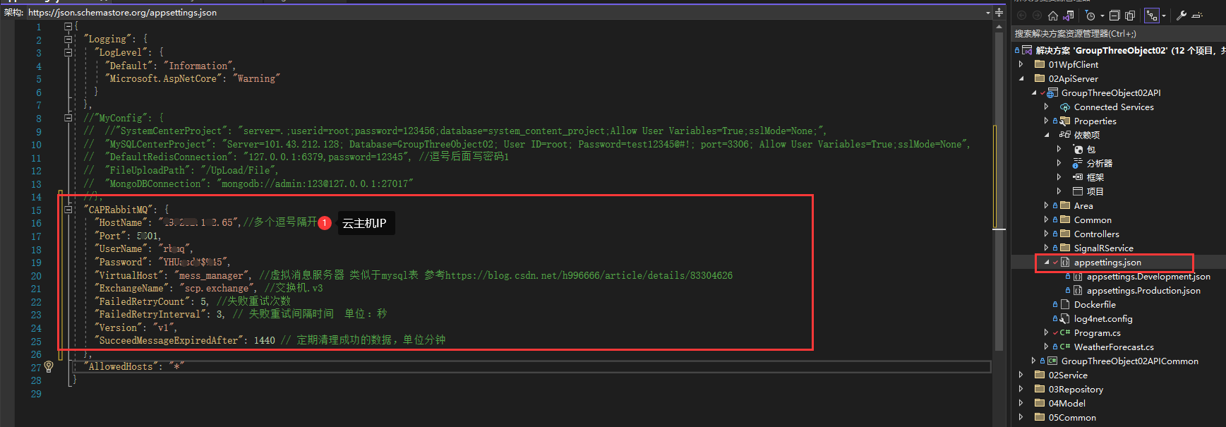 (放在了appsettings.json文件进行配置了,因为无论开发状态还是发布状态下都是用云主机上面的这个RabbitMQ)