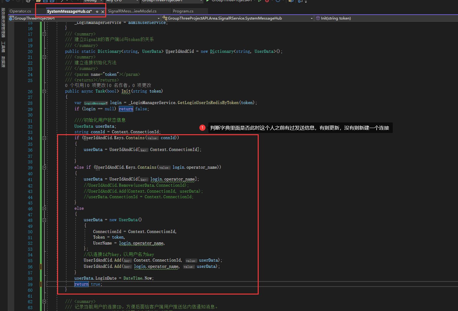 4、更新修改上一博客实现signalR推送消息创建连接初始化那里(SystemMessageHub类中)