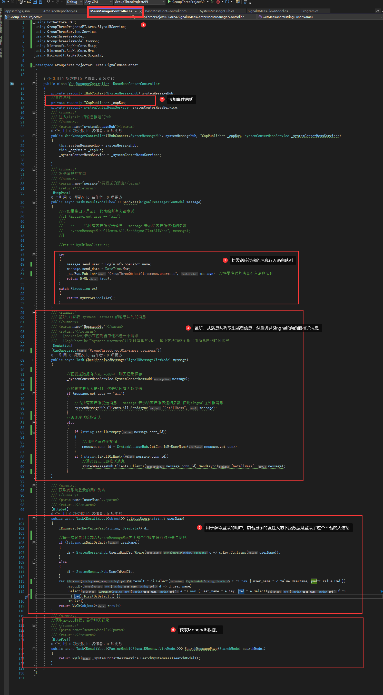 5、在上一博客实现signalR推送消息中发送消息的控制器处加入实现消息队列