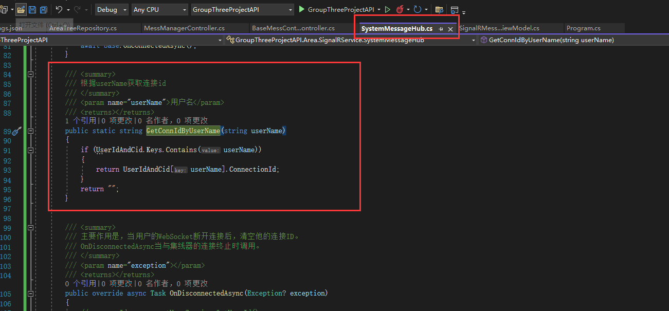 6、在SystemMessageHub类编写根据用户名获取到他的连接SignalR的连接ID