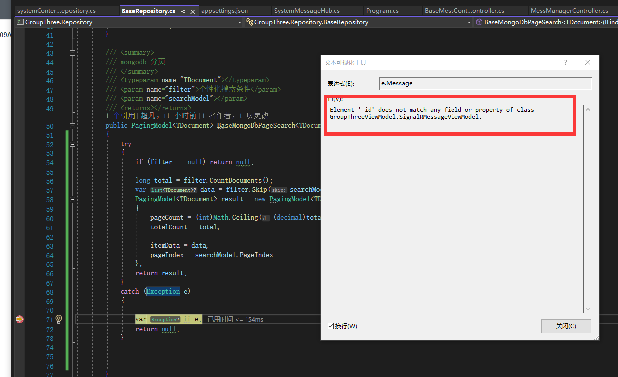 并且必须也要加上public ObjectId id { get; set; }字段--否则显示Mongodb数据时候报错
