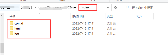 5、 再创建nginx文件夹,用于存放nginx容器的文件,并创建conf.d,html,log三个文件