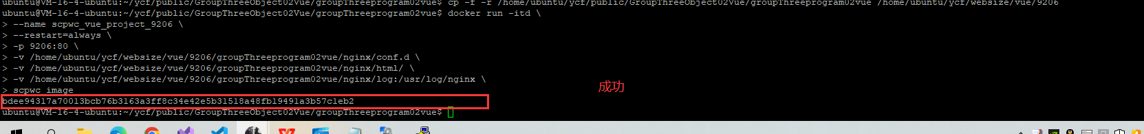 docker run -itd \ --name scpwc_vue_project_9206 \ --restart=always \ -p 9206:80 \ -v /home/ubuntu/ycf/websize/vue/9206/groupThreeprogram02vue/nginx/conf.d \ -v /home/ubuntu/ycf/websize/vue/9206/groupThreeprogram02vue/nginx/html/ \ -v /home/ubuntu/ycf/websize/vue/9206/groupThreeprogram02vue/nginx/log:/usr/log/nginx \ scpwc_image