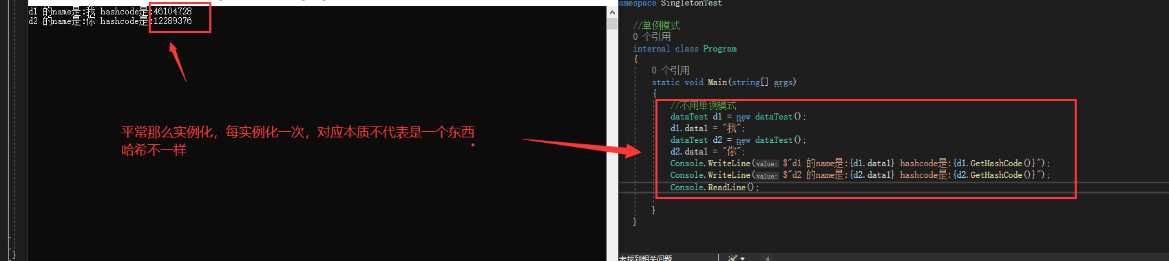 实现一个类只有一个实例解释:(同一个对象每new一次,会生成一个新的哈希Code、所以本质上它们不一样了,长此以往就会浪费资源,单例模式主为解决这个问题,保证数据一致性、节省资源)