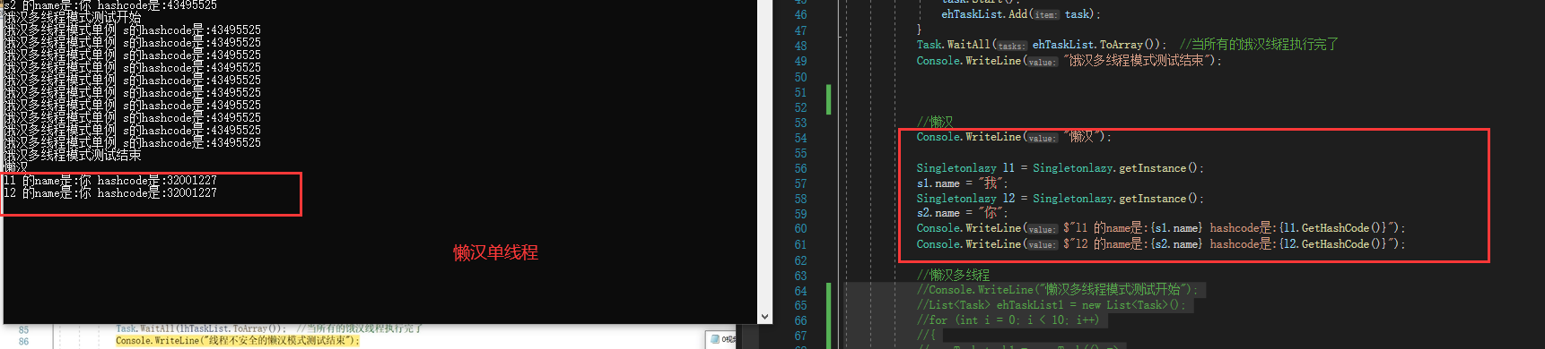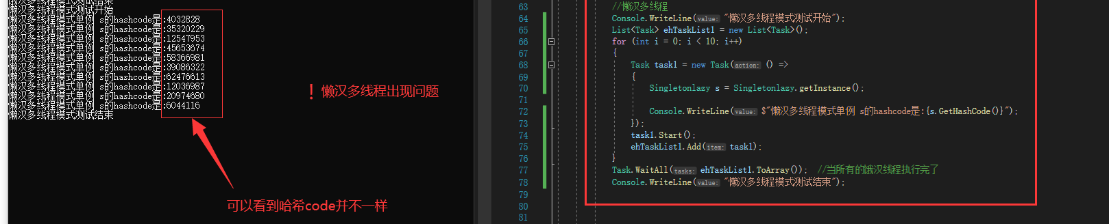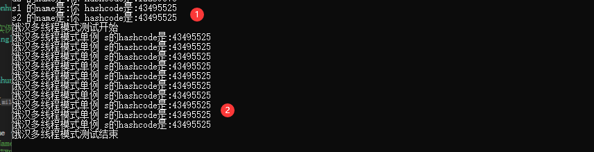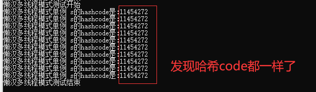 //多线程情况的懒汉方式存在问题 --调用时候出现问题(因为有可能个别线程运行时间比较长,后面线程又运行过来,所以出现哈希code不一样的情况)