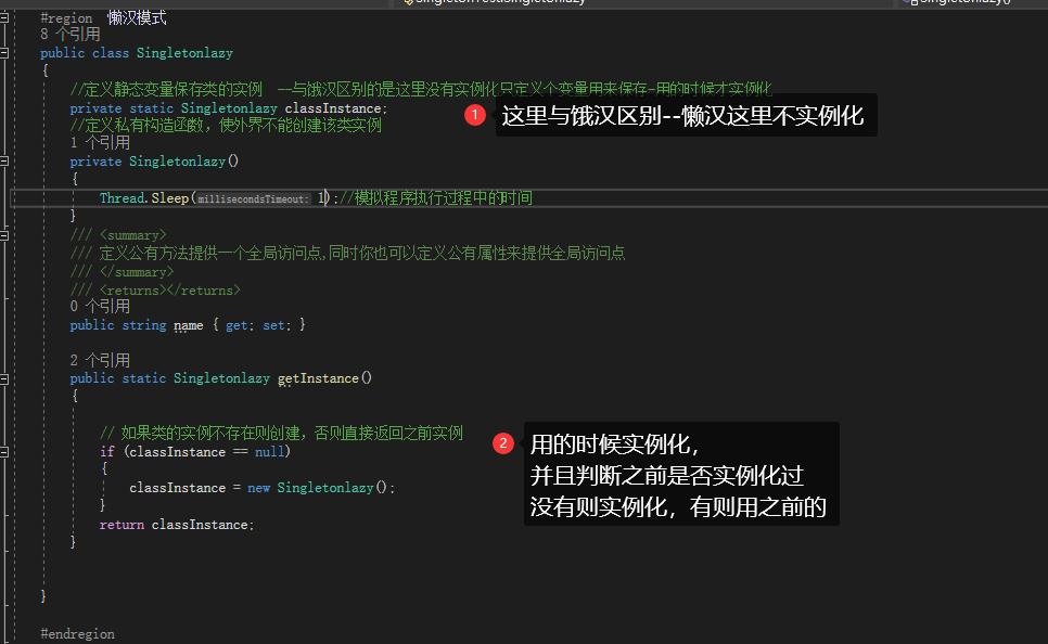 C#中单例模式主要用于实现一个对象只有一个实例,有懒汉和饿汉两种实现方式。