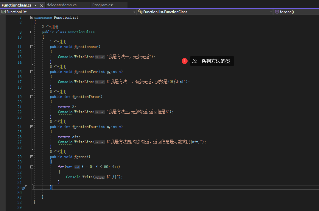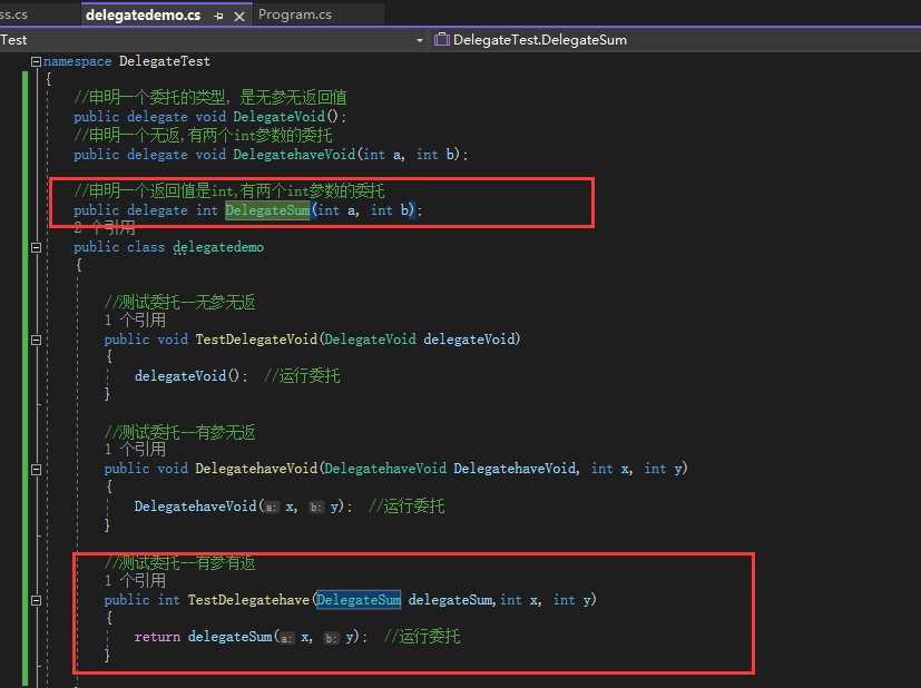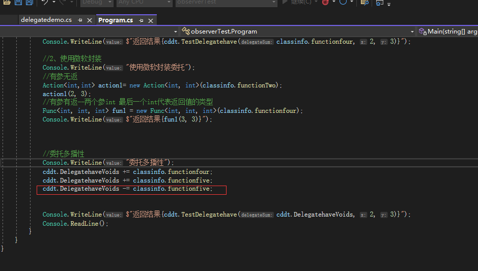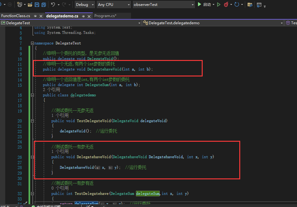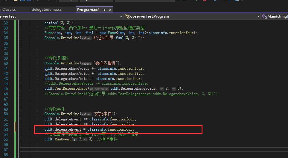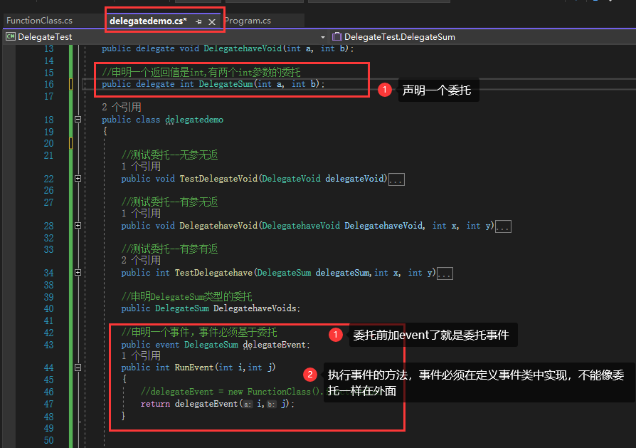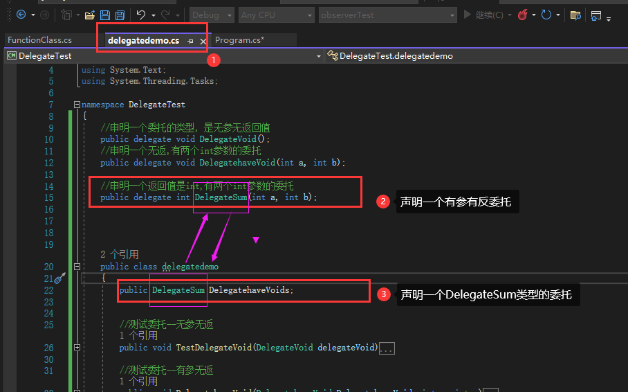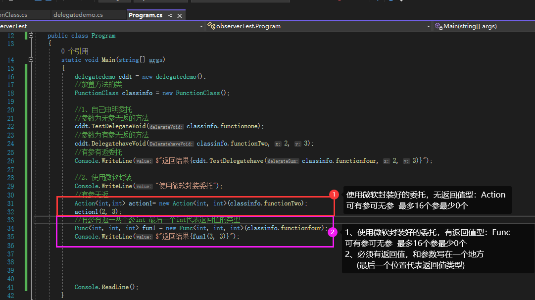 //声明一个定义好的委托类型的委托(用aciton或func也可以)