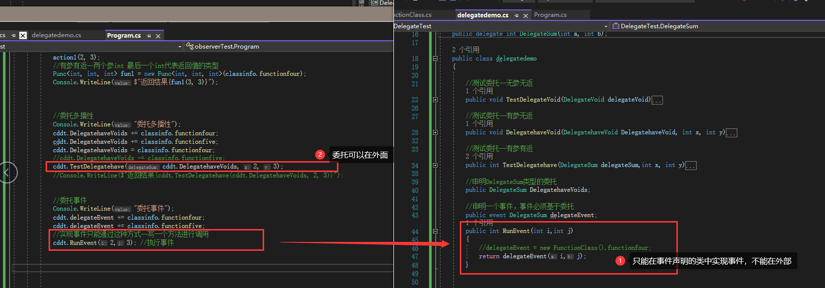 委托可以在类外部实现 事件不可以下类外部实现