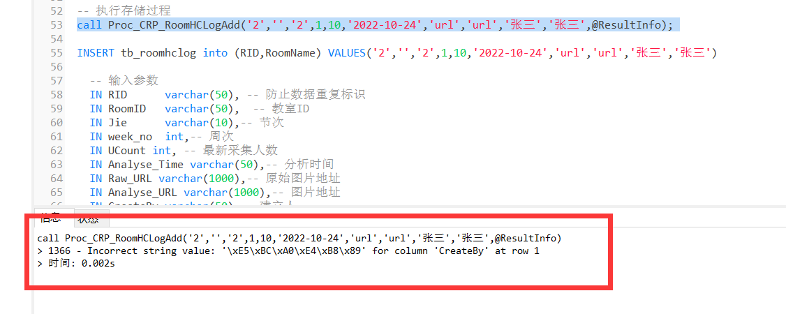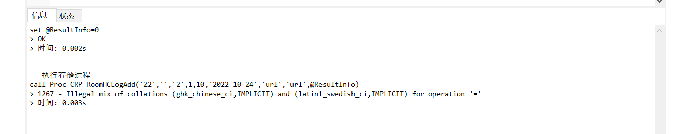 set @ResultInfo=1;(输出参数类型为inout类型时这里赋值会带入存储过程,否则out类型这里赋值多少都不影响,out类型这步也可以不写) -- 执行存储过程 call Proc_CRP_RoomHCLogAdd('输入参1','输入参2',@输出参ResultInfo);