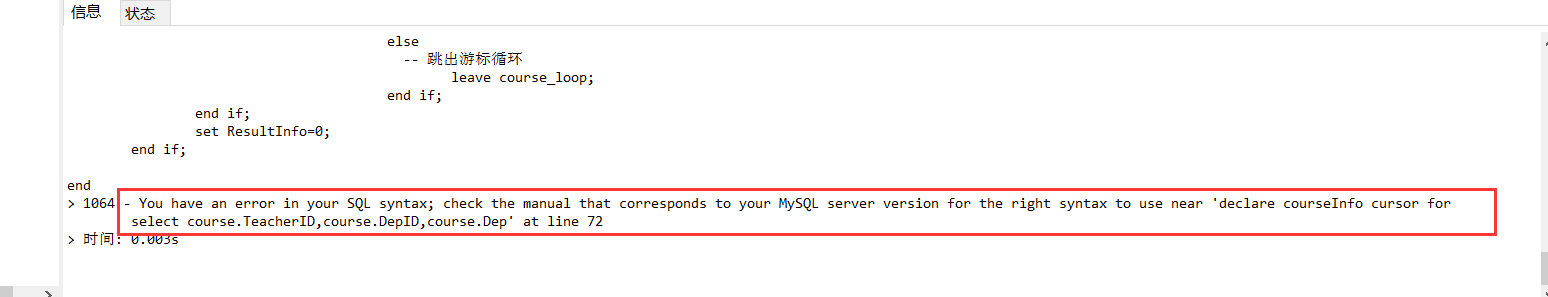 原因:mysql中使用游标必须遵守声明变量、游标声明、handler句柄这个顺序声明否则报错