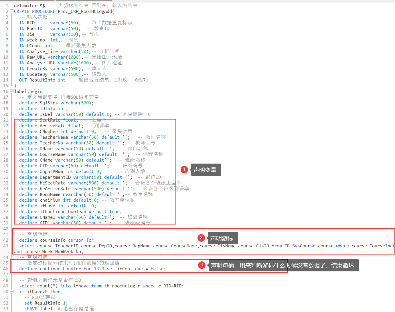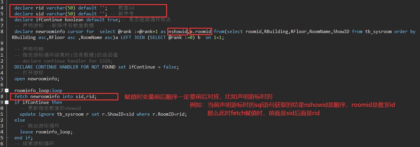 因为他们三者都必须在存储过程开始定义,如上图,在复杂存储过程中,句柄肯定不是一开始就需要用的,肯定在后面的逻辑中用到的,如上图定义的句柄中的参数1329表示当使用select 语句获取的数据没有值时,句柄就会抓取到错误从而执行句柄set后面的事件(会在不应该使用句柄的地方,句柄给执行了),所以我们需要在真正使用句柄之前重新给标签赋初始值。(本图逻辑是:定义一个boolean的标签默认为true,如果句柄抓取到错误则修改标签为false。本人是在遍历游标时使用的,当遍历游标没有数据时,这个句柄会抓取到错误,并把标签改为false,退出游标循环。因此我需要在打开游标语句前或后重新给标签赋值,如图)。