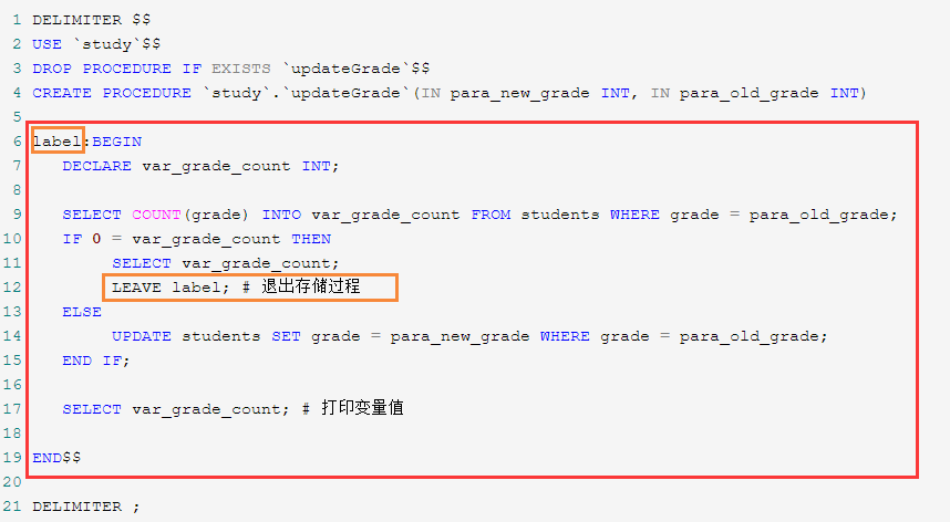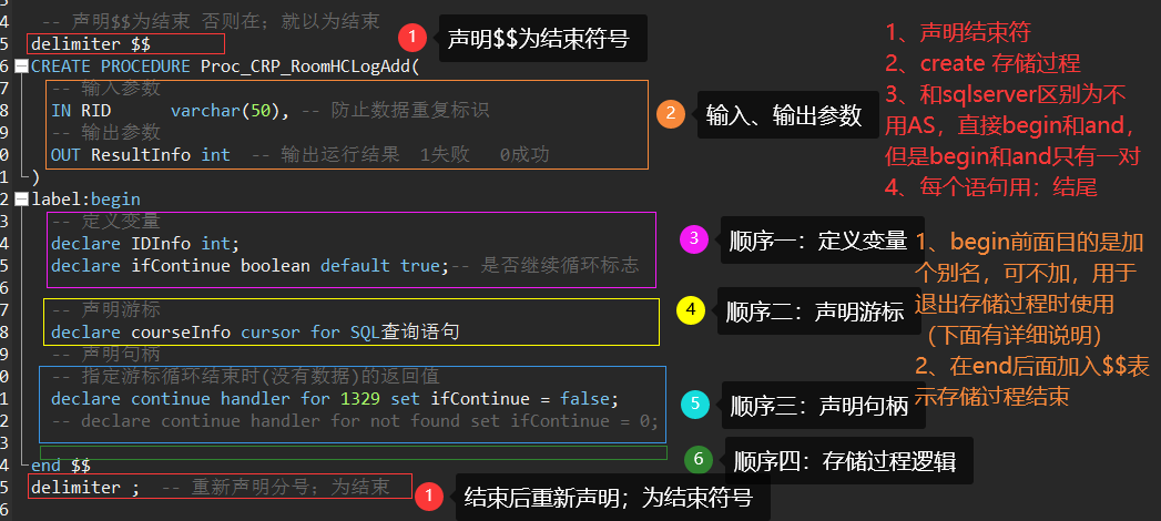 -- 声明结束符。因为MySQL默认使用‘;’作为结束符,而在存储过程中,会使用‘;’作为一段语句的结束,导致‘;’使用冲突