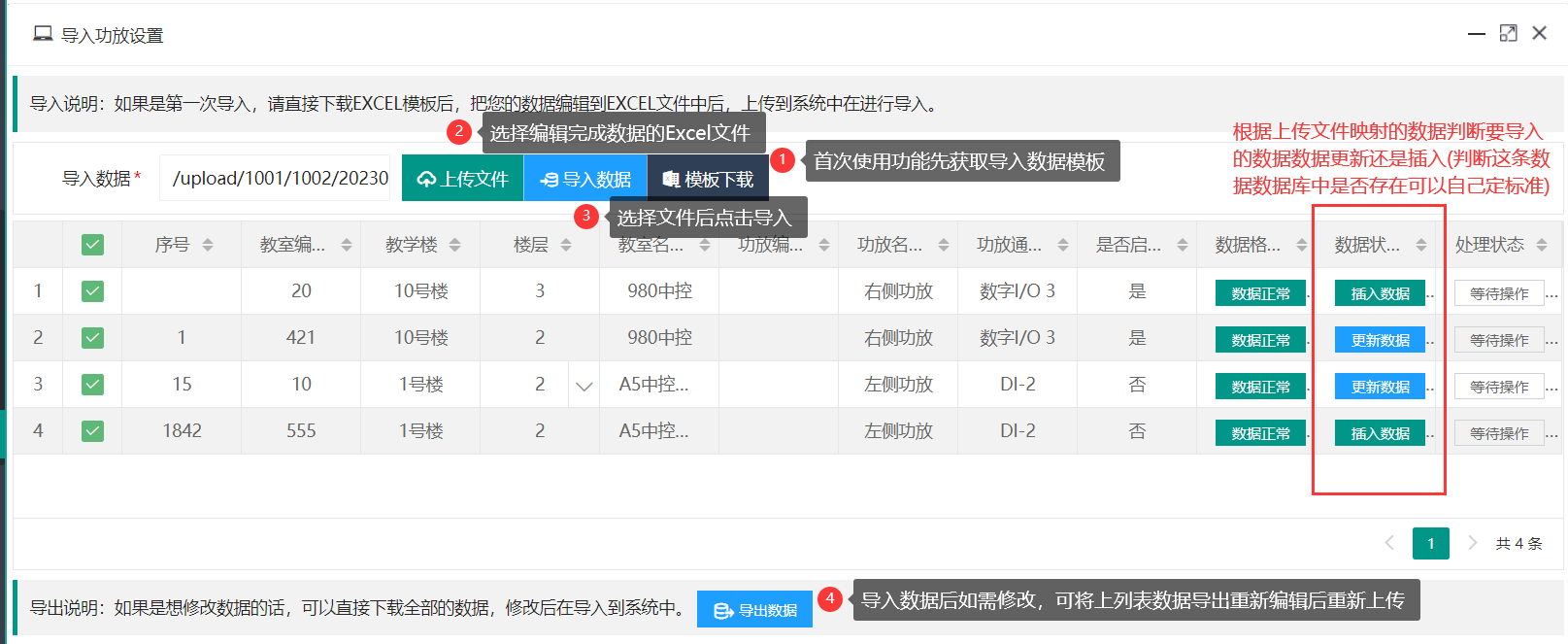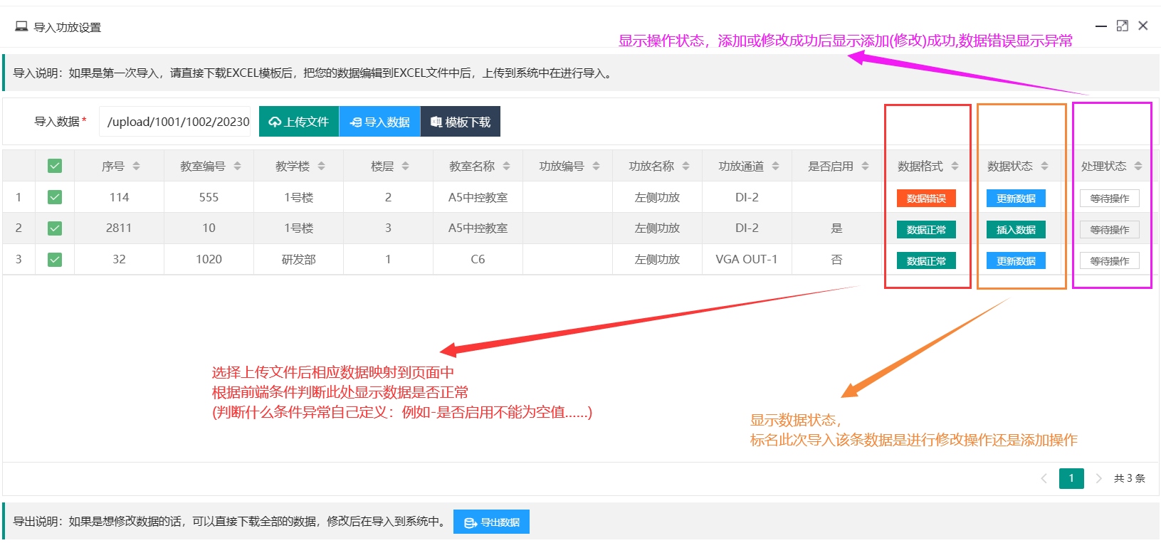 //给标题行起英文名(供前端使用的,最后返回给前端的对象就是这个名字)--如果前段需要的东西多于标题行,这里就把所需都写上 FieldEnglish = "id,building,floor,roomid,roomname,othername,othertype,othernum,otheracsway,otherurl,isenable,onote", //字典SQL语句(例如:此处excel中教室、设备类型、检测方式、是否启用为下拉输入形式)