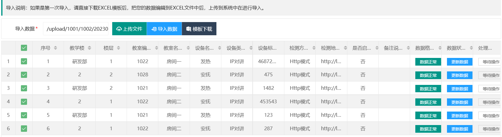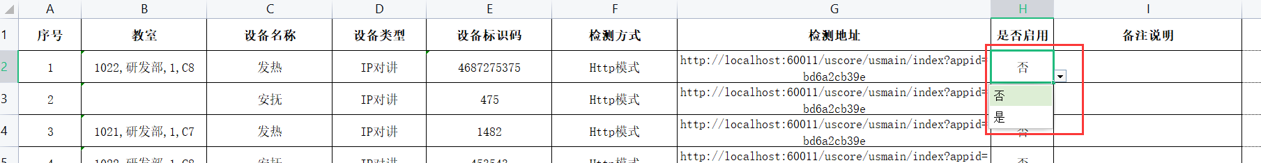 //Excel文件的标题行的所有标题信息 FieldChina是编写excel的标题行,要和导入的Excel模板列数量、汉字一模一样,分别对应相应行列的值 FieldChina = "序号,教室,设备名称,设备类型,设备标识码,检测方式,检测地址,是否启用,备注说明",