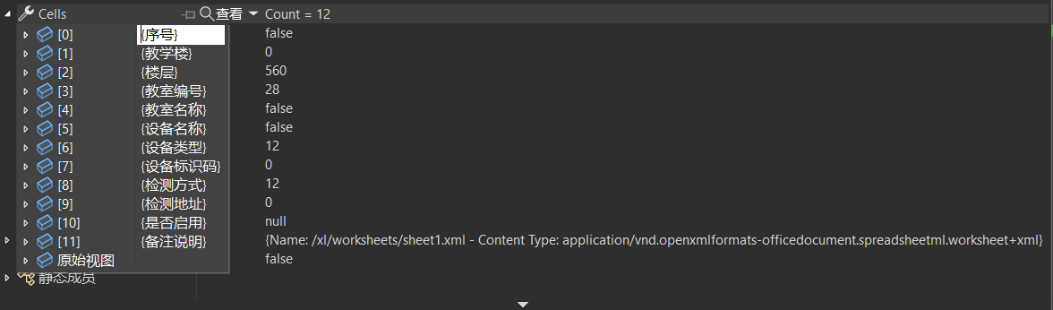 //通过MoveNext()得到集合中的所有元素。GetEnumerator是返回实例的枚举数 如图1: IEnumerator rowEnumerator = sheet.GetRowEnumerator(); dataTable.TableName = SheetName; //将枚举数推进到集合的下一个元素。 rowEnumerator.MoveNext(); //获取集合中位于枚举数当前位置的元素。 XSSFRow xSSFRow = (XSSFRow)rowEnumerator.Current; //循环向dataTable中插入Columns 添加列 for (int i = 0; i < sheet.GetRow(0).LastCellNum; i++) { if (xSSFRow.GetCell(i) != null) { dataTable.Columns.Add(xSSFRow.GetCell(i).ToString()); } else { dataTable.Columns.Add("column_name" + i); } } //将枚举推进到集合的下一个元素(也就是读取excel的第二行) 开始循环读取数据并插入到daterow中 效果如下图2 while (rowEnumerator.MoveNext()) {