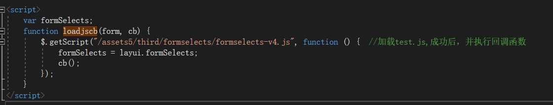function loadjscb(form, cb) { $.getScript("/assets5/third/formselects/formselects-v4.js", function () { //加载test.js,成功后,并执行回调函数 formSelects = layui.formSelects; cb();//上面那步的参数二 }); }