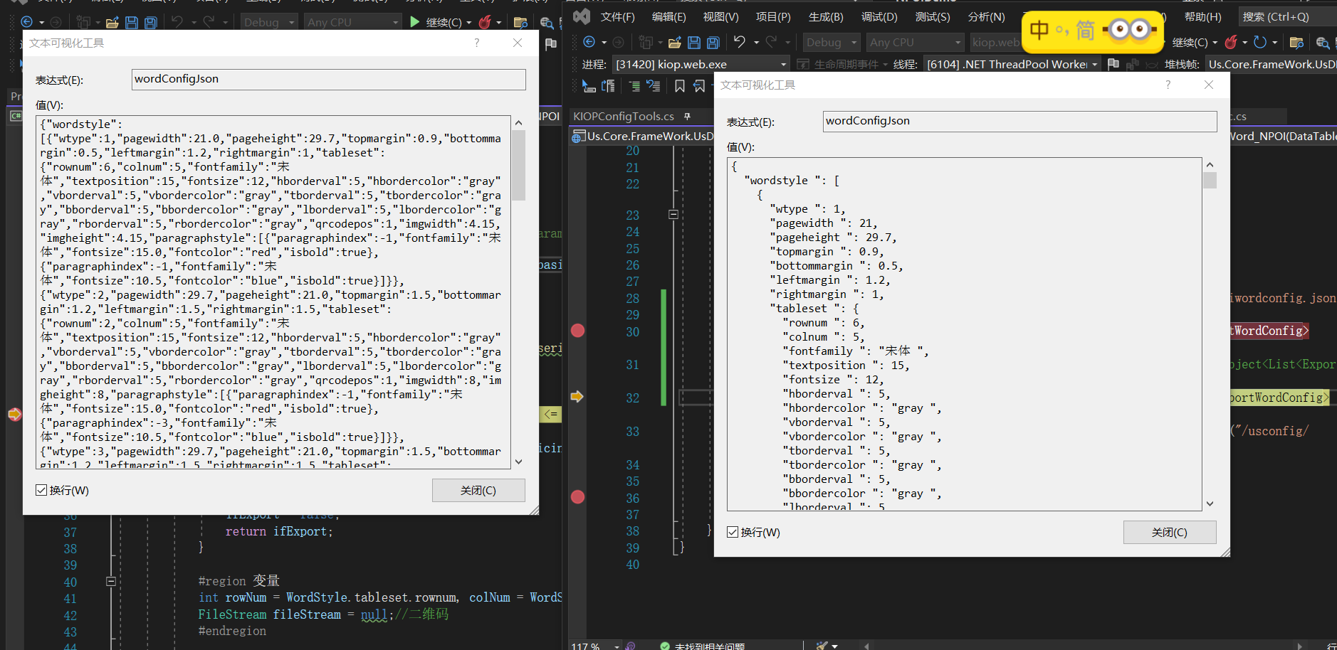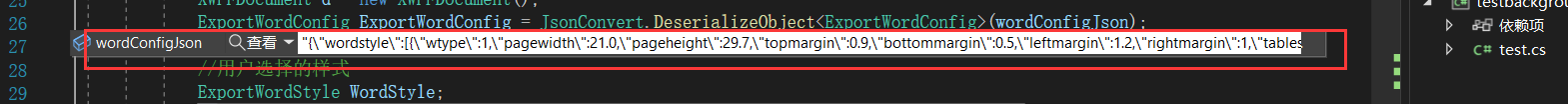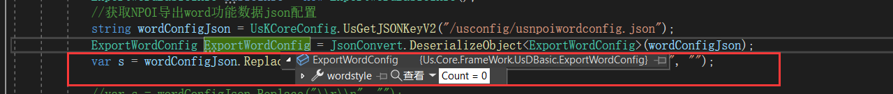 string wordConfigJson = UsKCoreConfig.UsGetJSONKeyV2("/usconfig/usnpoiwordconfig.json"); var wordConfigJsonstr = wordConfigJson.Replace("\n", "").Replace(" ", "").Replace("\t", "").Replace("\r", ""); //反序列化 ExportWordConfig ExportWordConfig1 = JsonConvert.DeserializeObject<ExportWordConfig>(wordConfigJsonstr);