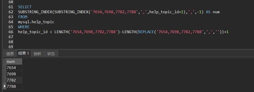 SELECT SUBSTRING_INDEX(SUBSTRING_INDEX('7654,7698,7782,7788',',',help_topic_id+1),',',-1) AS num FROM mysql.help_topic WHERE help_topic_id < LENGTH('7654,7698,7782,7788')-LENGTH(REPLACE('7654,7698,7782,7788',',',''))+1