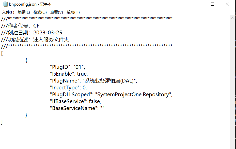 public class UsBhpItem { /// <summary> /// 序号 /// </summary> public string PlugID { get; set; } /// <summary> /// 模块名称 /// </summary> public string PlugName { get; set; } /// <summary> /// 需要注入的程序集名 (类库名) /// </summary> public string PlugDLLScoped { get; set; } /// <summary> /// 是否注入基类 /// </summary> public bool IfBaseService { get; set; } /// <summary> /// 注入的基类 /// </summary> public string BaseServiceName { get; set; } /// <summary> /// 注入类型 /// </summary> public InJectType InJectType { get; set; } = InJectType.Scope; /// <summary> /// 是否启用 /// </summary> public bool IsEnable { get; set; } } public enum InJectType { /// <summary> /// 瞬时注入 /// </summary> Transient, /// <summary> /// 作用域注入 /// </summary> Scope, /// <summary> /// 单例注入 /// </summary> Single, NoNeed }