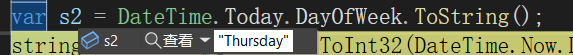//Sunday Monday Tuesday Wednesday Thursday Friday Saturday DateTime.Today.DayOfWeek.ToString();