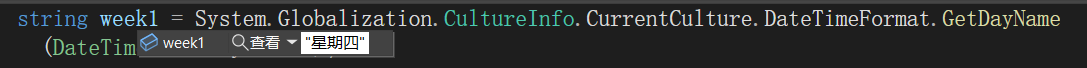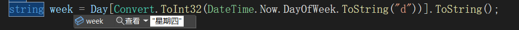 //第一种 string[] Day = new string[] { "星期日", "星期一", "星期二", "星期三", "星期四", "星期五", "星期六" }; string week = Day[Convert.ToInt32(DateTime.Now.DayOfWeek.ToString("d"))].ToString(); //第二种: string week1 = System.Globalization.CultureInfo.CurrentCulture.DateTimeFormat.GetDayName(DateTime.Now.DayOfWeek);