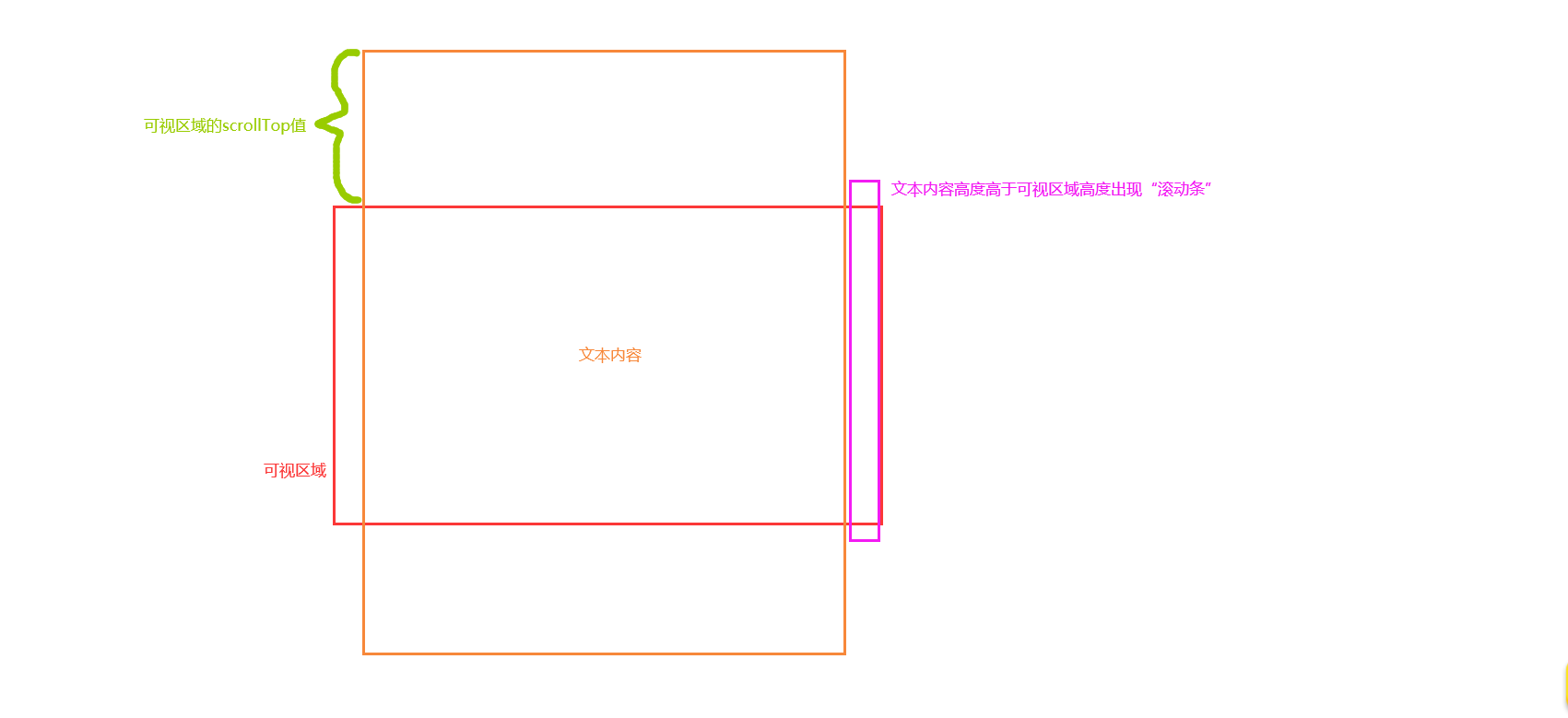 。很明显,“外层元素中的内容”高过了“外层元素”本身.当向下拖动滚动条时,有部分内容会隐没在“外层元素的上边界”之外,scrollTop就等于这部分“不可见的内容”的高度。