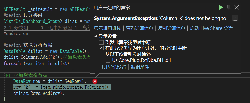原因:datatable中没有k列、需要 dtlist.Columns.Add("k");//加载表头数据