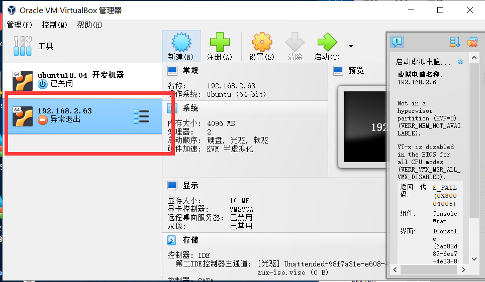 原因:确保本机BIOS设置中开启了硬件虚拟化功能,否则会出现E_FALL(0x80004005) 报错