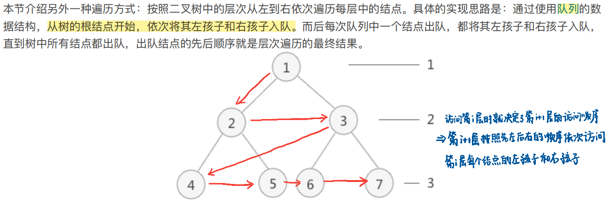 - Each Loop: 取出队首元素:①访问该元素 ②将该节点的左孩子右孩子依次入队(先入队的先访问,所以如果是从左至右访问每一层就先把左孩子入队,从右至左访问就先把右孩子入队)